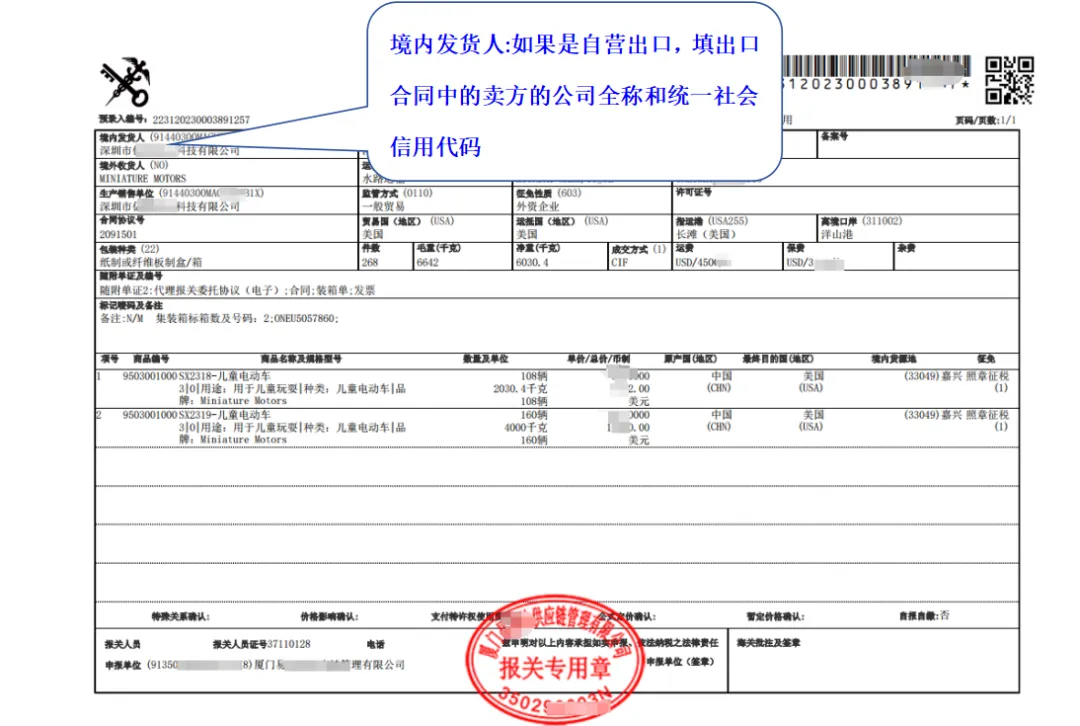 境内发货人:如果是自营出口,填出口合同中的卖方的公司全称和统一社会信用代码