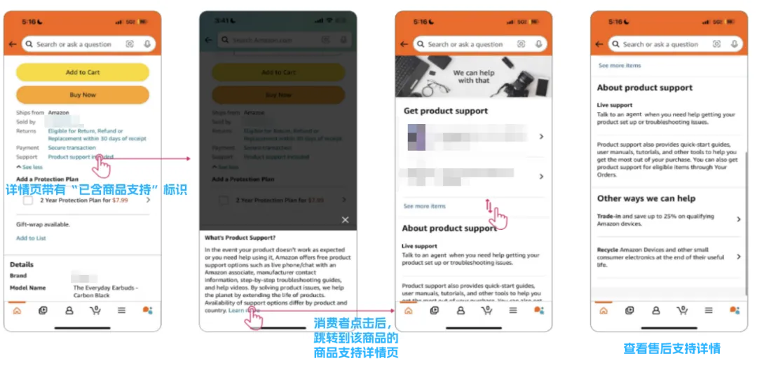 除Rufus外,消费者在购物的售前、售后全流程均可看到“商品支持”选项,实现“未退先救”,主动提供解决方案,有效打消顾客退货意向。