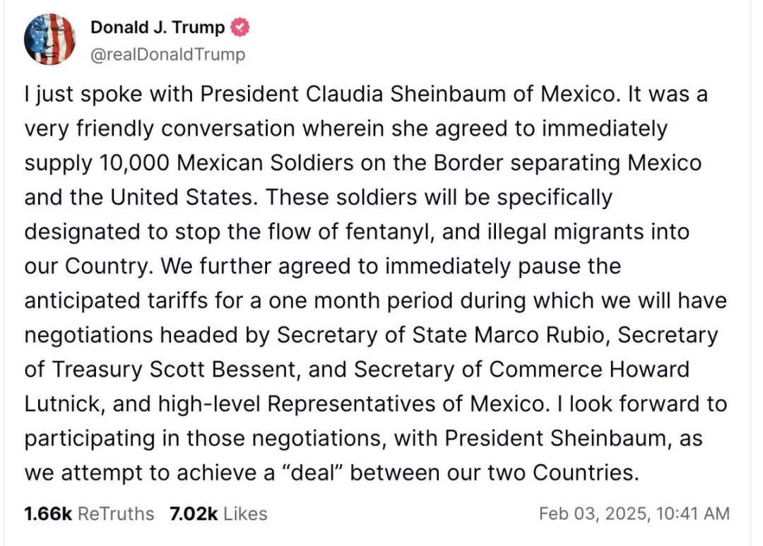 当地时间2月3日早些时候,特朗普发布社交媒体表示,他与墨西哥总统辛鲍姆达成了一系列协议。墨西哥将立即派遣1万名国民警卫队人员加强北部边境巡逻,以防止从墨西哥向美国贩运毒品。双方团队将从当天开始在安全和贸易两个方面继续开展工作。关税征收计划从当天起暂停实施一个月。