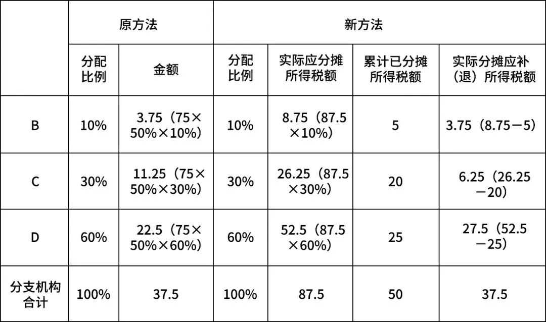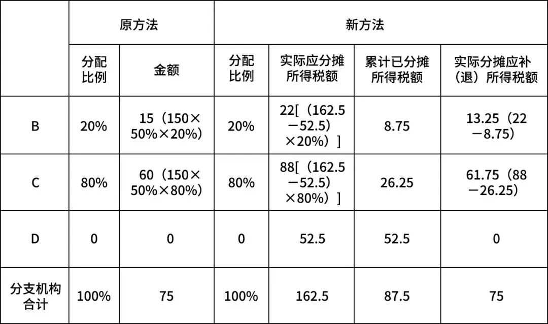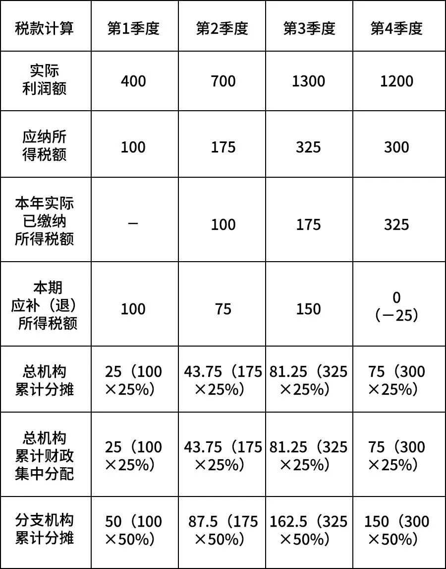 一是调整总分机构税款分摊计算方法。将汇缴环节总分机构分摊税款计算方法推广至预缴环节,即企业先对截止到本月(季)度应纳所得税额进行分摊,再由总、分机构分别抵减其已分摊预缴税款,并计算本月(季)度应补(退)所得税。举例说明如下: