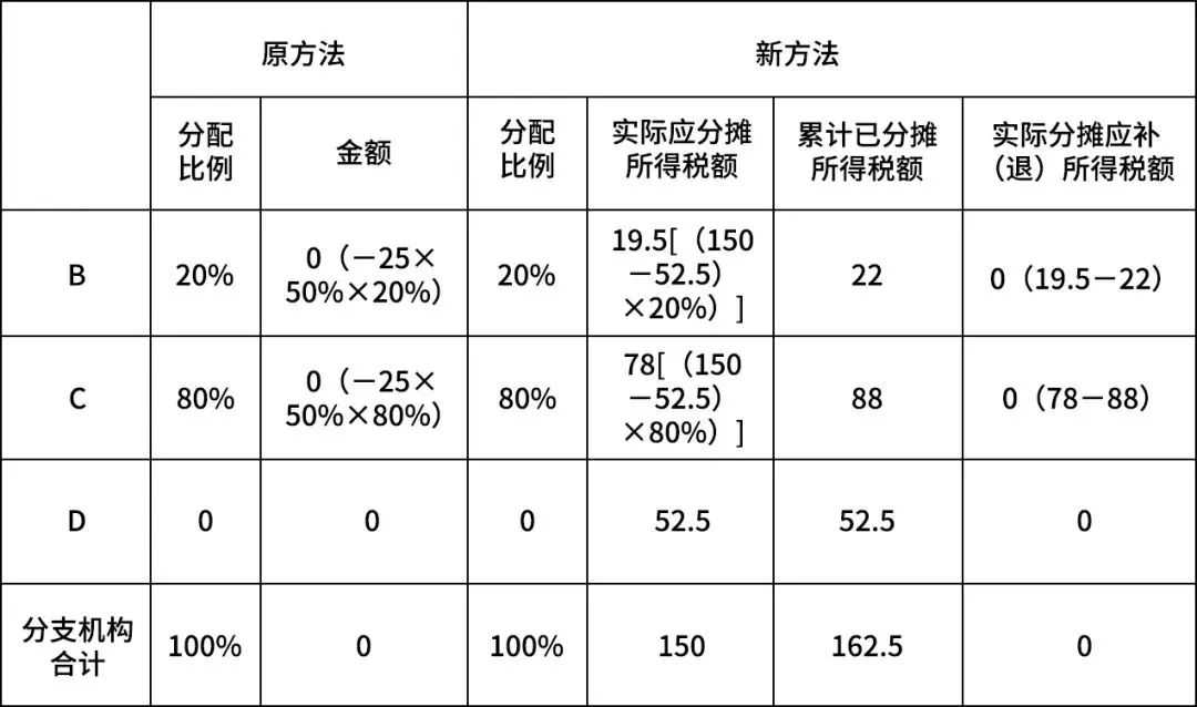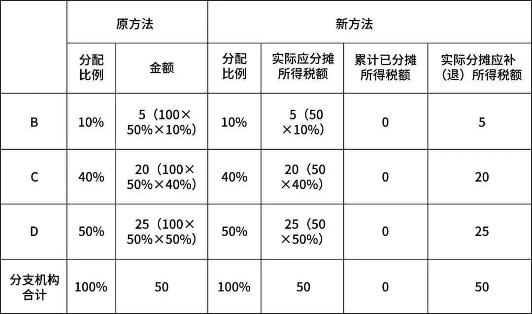 需要说明的是,汇总纳税企业如果不存在注销分支机构、分摊税款计算不准确等情形,无论按原计算方法,还是按新计算方法,结果都是一样的。但是,若汇总纳税企业前期预缴环节未准确计算分摊税款或当季发生分支机构注销情形,新计算方法将通过全量分摊方式,对全年分摊税款重新计算。案例中,由于第二季度发现第一季度C、D分支机构分配比例计算错误,在第二季度申报时按照新方法计算的C分支机构应补税额比原方法少5万元;D分支机构应补税额比原方法多5万元;B分支机构分配比例没有错误,两种方法计算结果一致。D分支机构注销后,需重新计算分配比例,在第三季度申报时按照新方法计算的B分支机构应补税额比原方法少1.75万元,C分支机构应补税额比原方法多1.75万元。