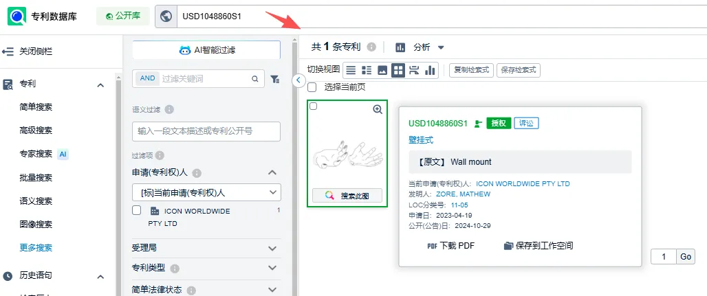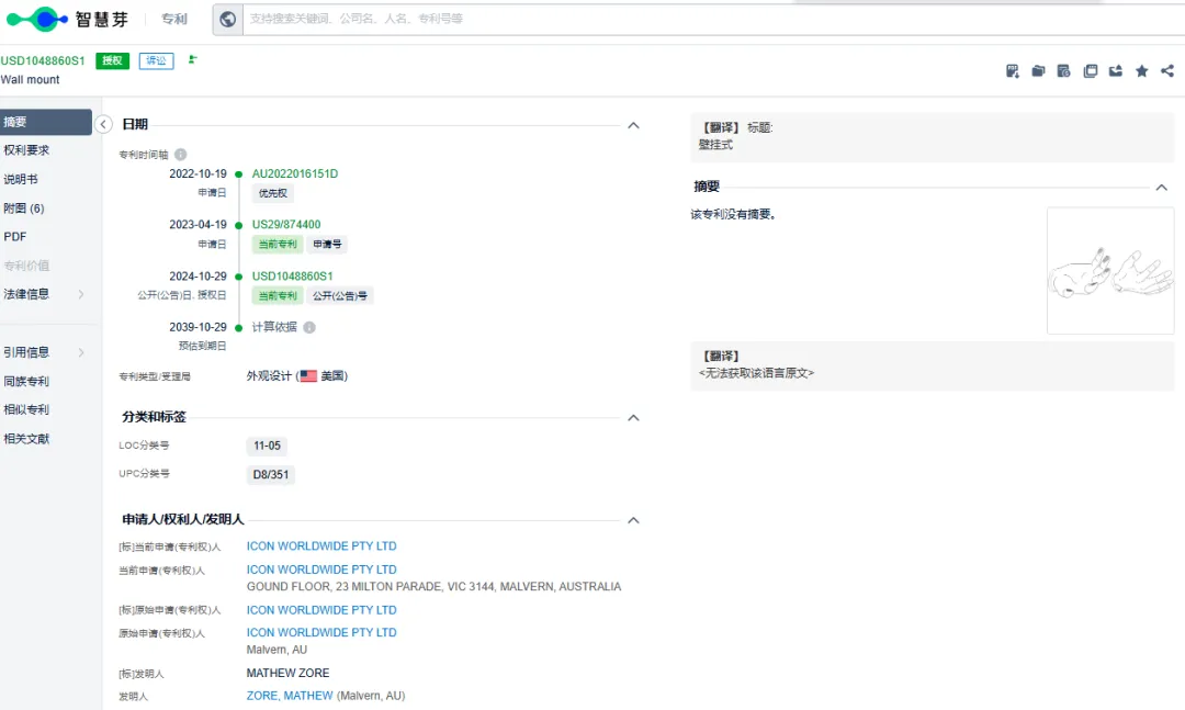 经查询于这款手掌壁挂架(专利名称为 “WALL MOUNT”墙面支架)产品于2023年4月19日申请,于2024年10月29号在美国获得授权,外观专利(专利号:USD1048860S1)。