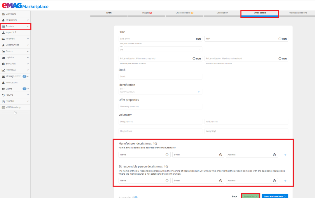 如何在 eMAG Marketplace 平台中填写 GPSR 信息