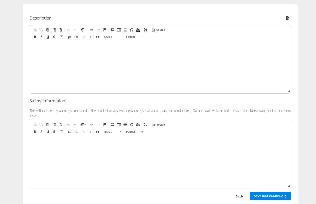 在填写产品描述的字段下方,您还必须填写有关 安全信息 的具体细节。