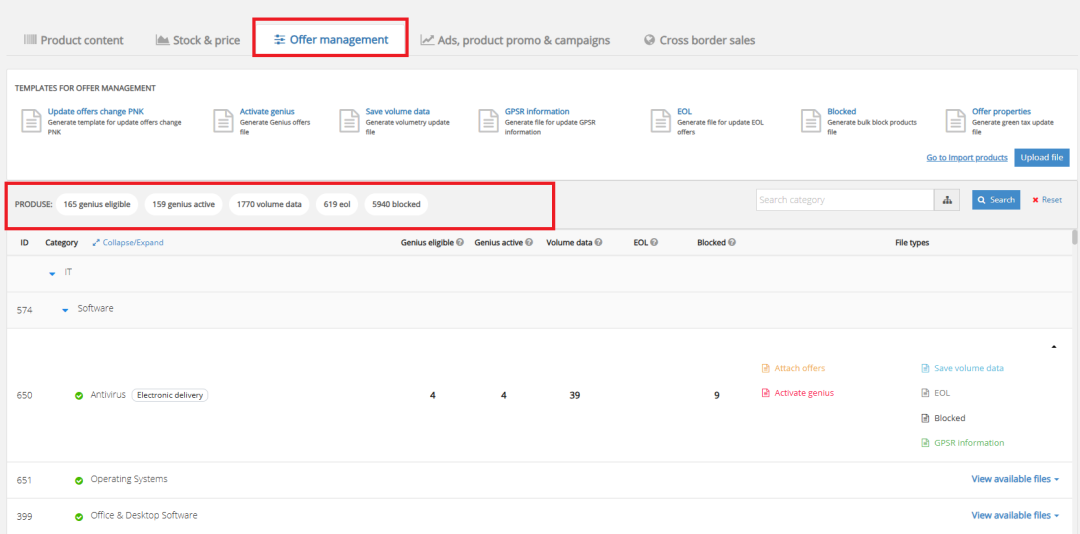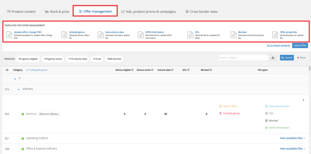 如果您只想为产品组合中的特定类别添加此信息,请先确认您感兴趣的类别名称,然后点击其旁边的“查看可用文件”,接着选择“生成 GPSR 信息文件”的按钮。