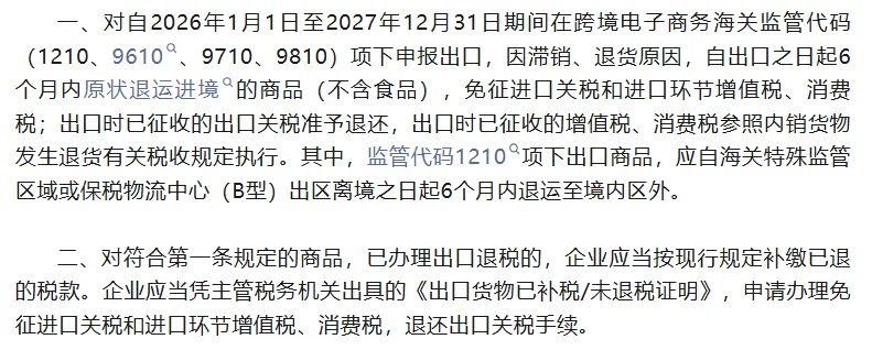 公告明确延续跨境电子商务出口退运商品税收优惠,实施期限从2026年1月1日到2027年12月31日,为期两年。