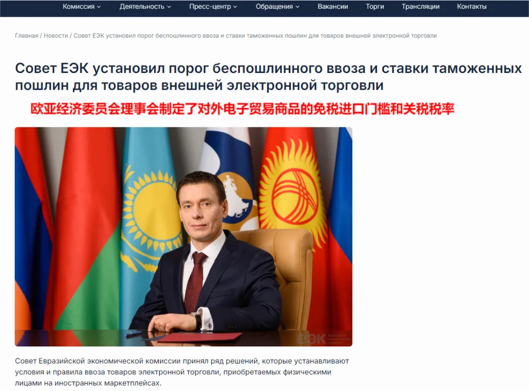 欧亚经济委员会(EEC)发布公告,确定2026年7月1日起,俄罗斯、白俄罗斯、哈萨克斯坦、吉尔吉斯斯坦、亚美尼亚五个成员国,对价值低于200欧元的个人跨境电商包裹免征进口关税。