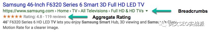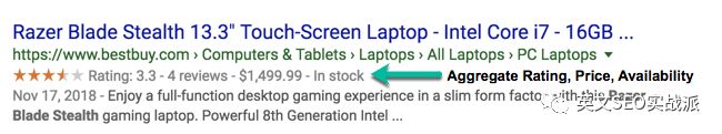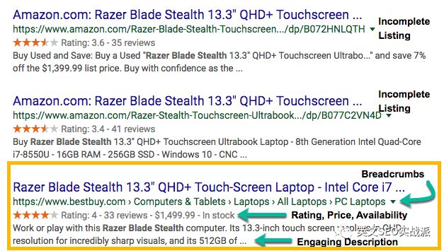 通过Schema.org或其他几种数据化结构类型来标记URL,Best Buy已经能够在SERP中展示面包屑导航,总评分,价格和是否可以购买等富文本信息。