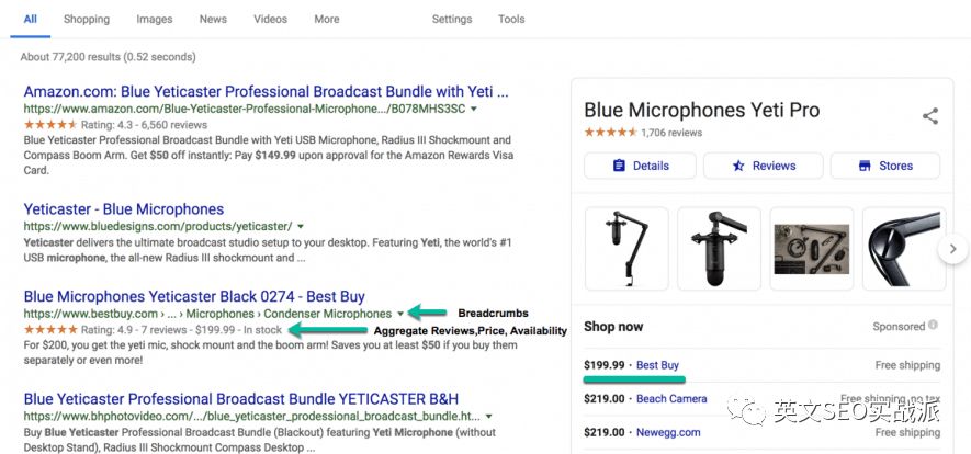 富文本信息为一般的电商独立站提供了脱颖而出的机会,即使当你不是搜索结果当中的第一。比如,在“blue microphones yeticaster price”的搜索结果里,你会选择什么产品?