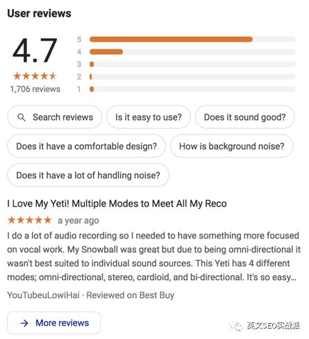 Best Buy在这种特定的情况里展示了很多有用的信息。在右边的知识面板中,谷歌展示了在所有竞争者中,Best Buy的价格最便宜,并且显示了总共1706个好评。如果你往下滑动,你会看到已经做好了分类的评价,并且Best Buy的评价在第一位展示: