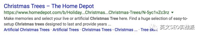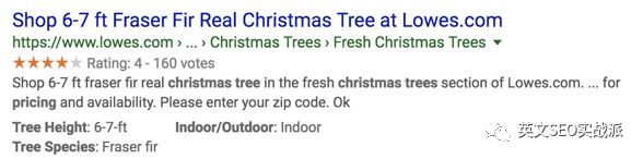 在上面的案例中,Home Depot正在宣传圣诞树这个产品。你可以看到那个页面已经被谷歌很明确的读懂为是一个产品细节面。然而我们并没看到关于产品的价格和评价。它只有引导用户到其他产品种类的网站链接,这些链接可能和用户意图搜索有关。