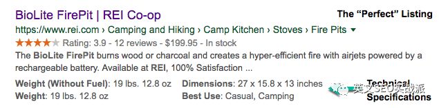 在下面的例子里,你将会看到在Meta Description下面的地方显示了产品列表的科技规格。这个富文本信息能够让客户在进入网站前,就得到关于产品尺寸,使用方法和重量等信息。