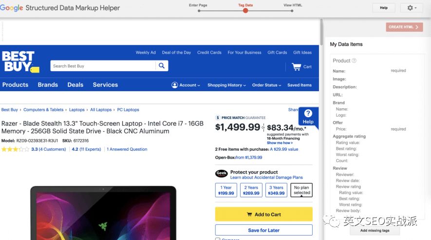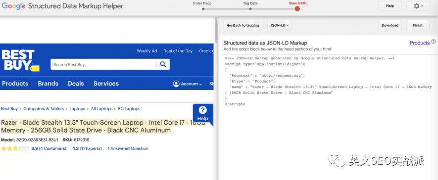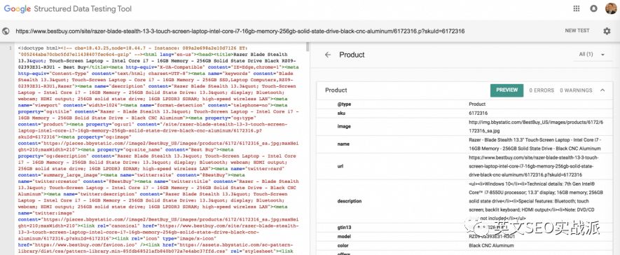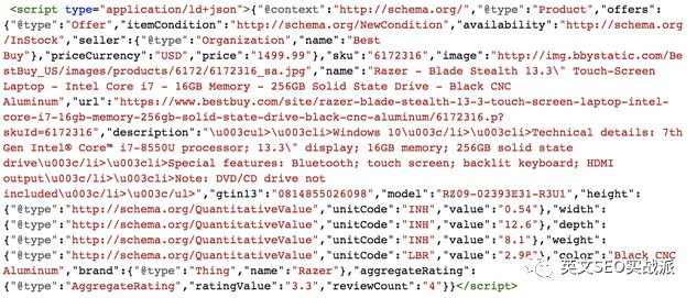 用上面的案例,从Best Buy对Razer Blade Stealth 13.3寸笔记本电脑的搜索结果,我们可以看到他们的团队已经使用JSON+LD去告诉搜索引擎在这个页面上