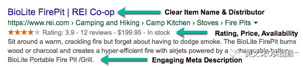 在上面的案例中,Best Buy做的很好,标示了产品拥有库存并且现在销售的价格是$1499.99。为搜索者一次性提供价格,是否在售,用户评分这些信息对搜索者是否选择你们作为他们购买的商家有很大的影响。