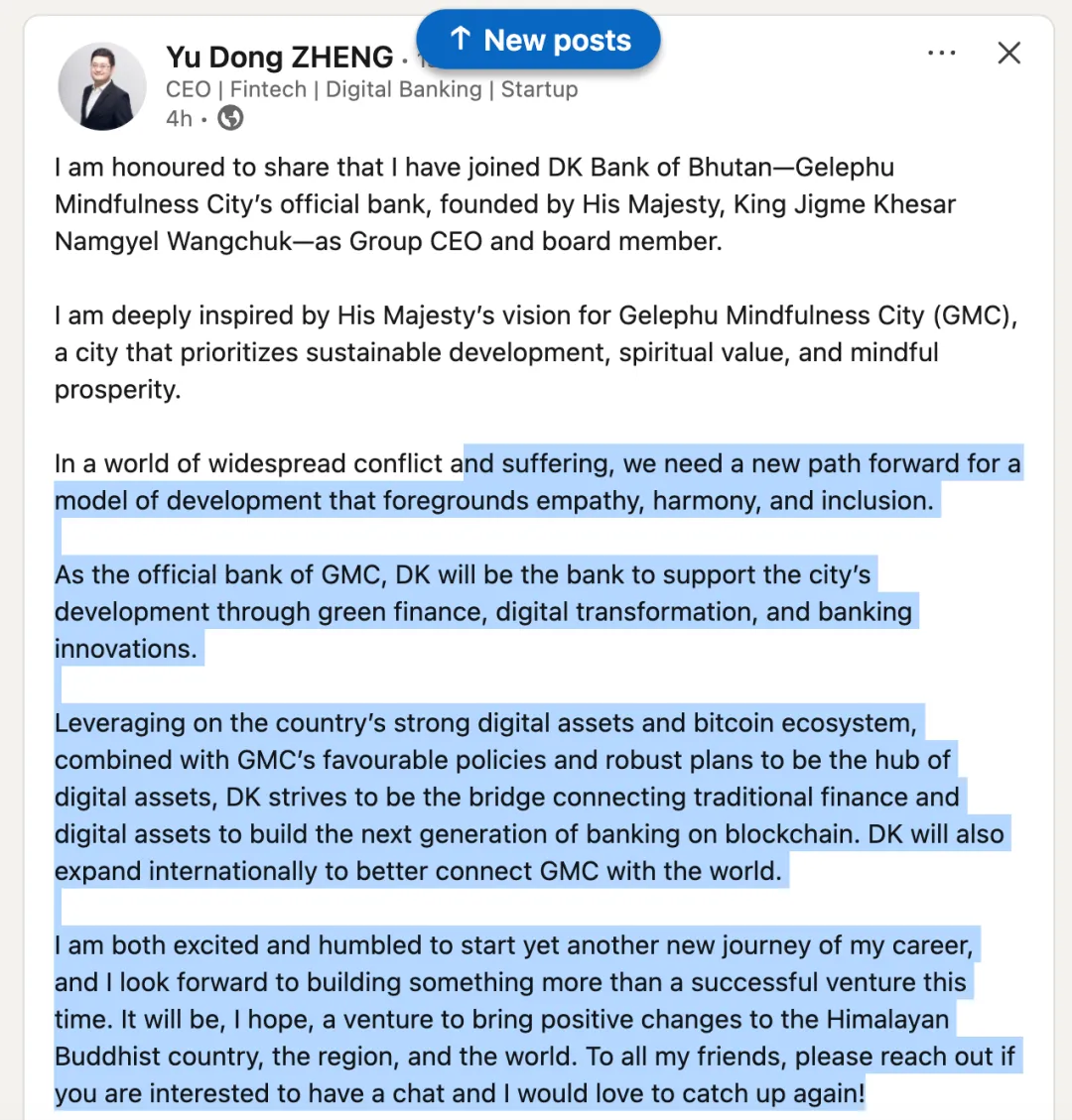 我很荣幸地分享,我已加入不丹DK银行 - 吉列普正念之城(Gelephu Mindfulness City, GMC)的官方银行,由不丹国王吉格梅·凯萨尔·纳姆耶尔·旺楚克陛下创立 - 担任集团 CEO 及董事会成员。