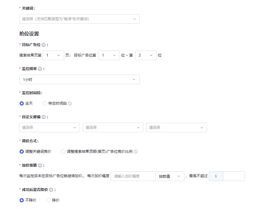 亚马逊 70%的订单来自搜索结果首页,90%都集中在前 3 页!没卡到这些位置,基本等于把近九成潜在客户让给对手,所以 “广告卡位” 是破局关键。告诉大家一个我在用的一款亚马逊广告管理专业工具-星拓,可以实现关键词精准抢位,比如,你只需设定好关键词想抢到的位置,在搜索结果哪一页大概第几位,监控频率和时间段,能够接受的加价幅度,星拓系统就会自动帮你把关键词推到你预期的位置,稳住核心词的广告坑位