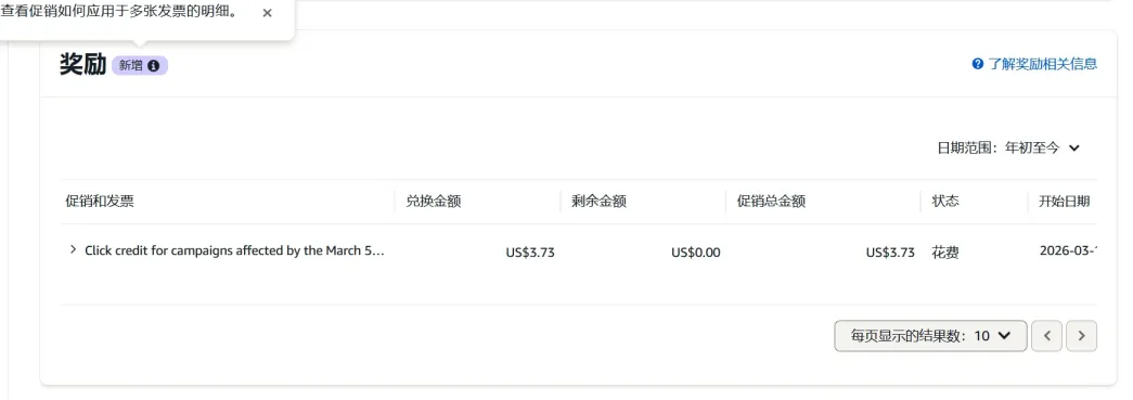 第二步,在明细列表中仔细寻找一条特定记录。该记录的英文名称大致为:Click credit for campaigns affected by the March 5 2026 Amazon.com service disruption,即2026年3月5日服务异常期间受影响广告活动的点击补偿。