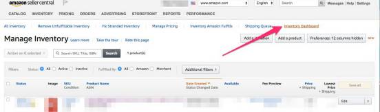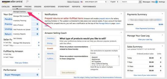 首先,在卖家中心找到“Inventory ”选项,点击“Manage Inventory”: