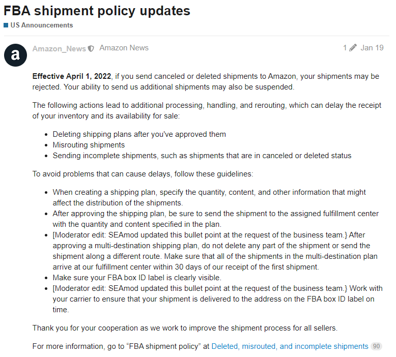 如果卖家删除了入库计划中的部分货件,或者在多目的地计划中的第一批货件送达亚马逊后的30天内,亚马逊未收到该计划中的所有货件,那么卖家会收到电子邮件通知。(一个或多个货件由于亚马逊合作承运人单方面的操作或疏忽而发生延迟的情况除外。)