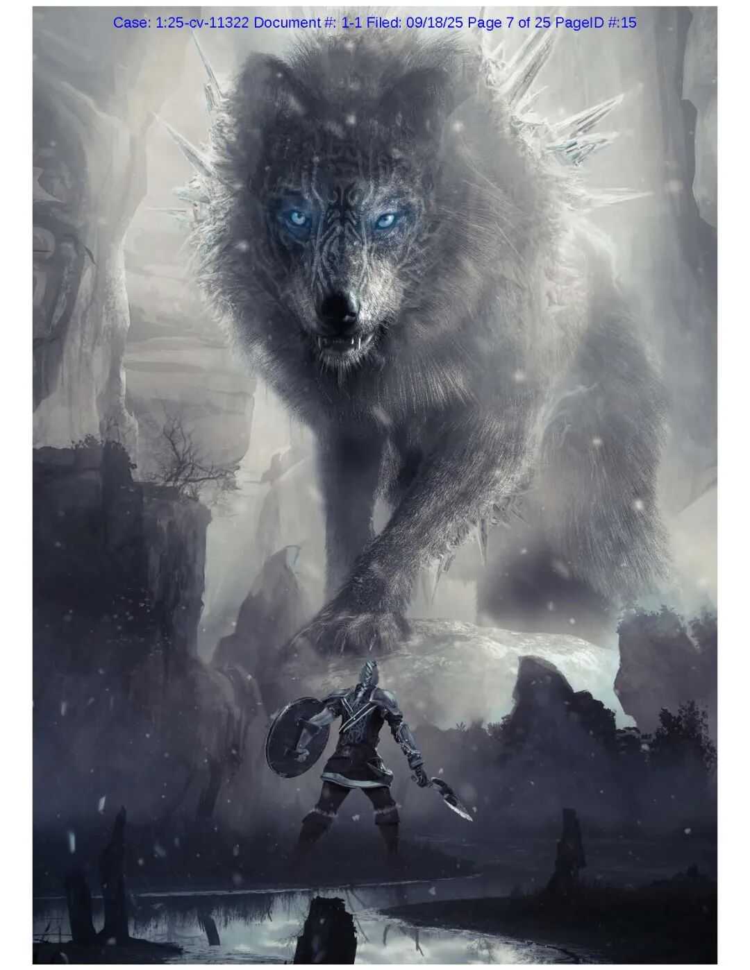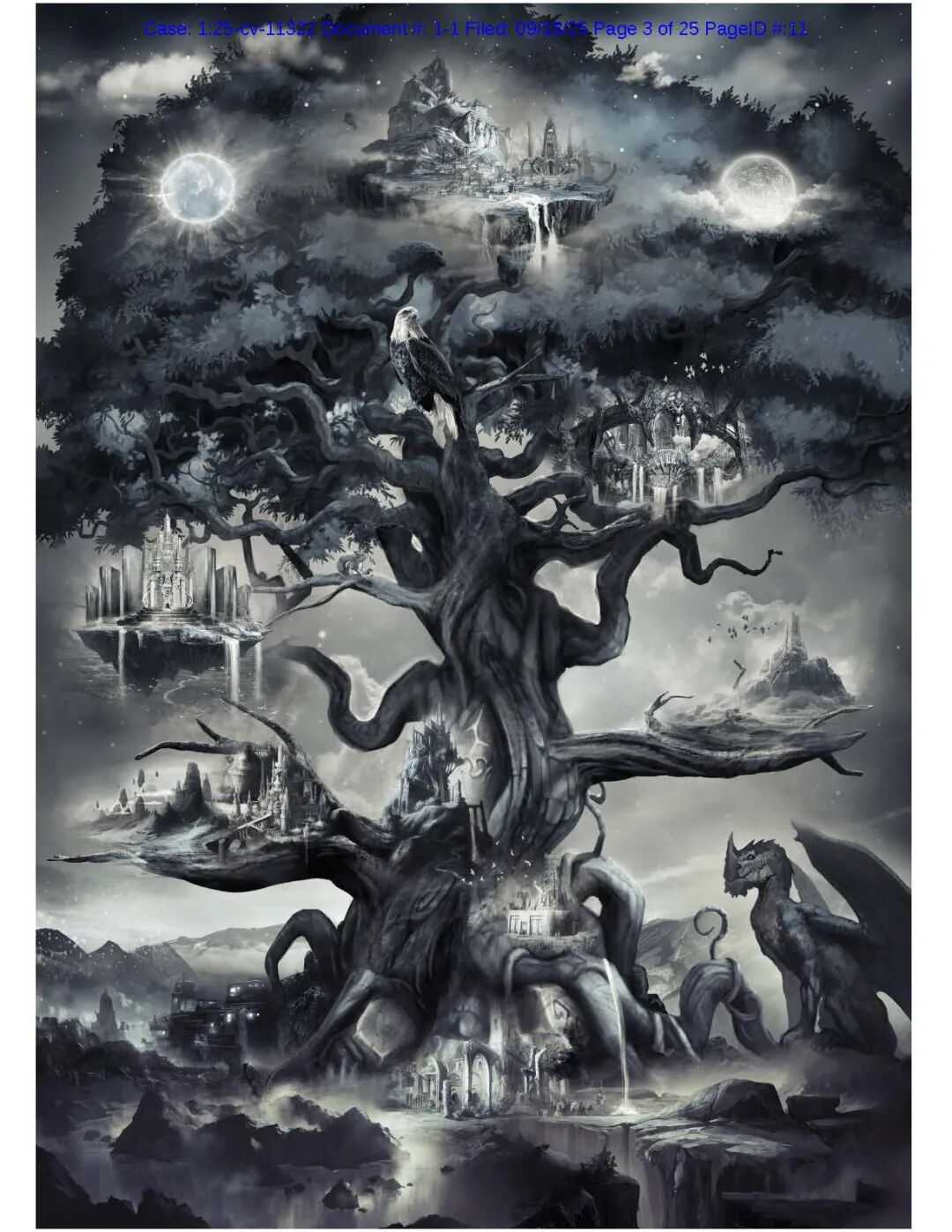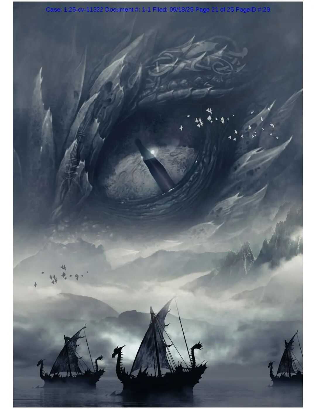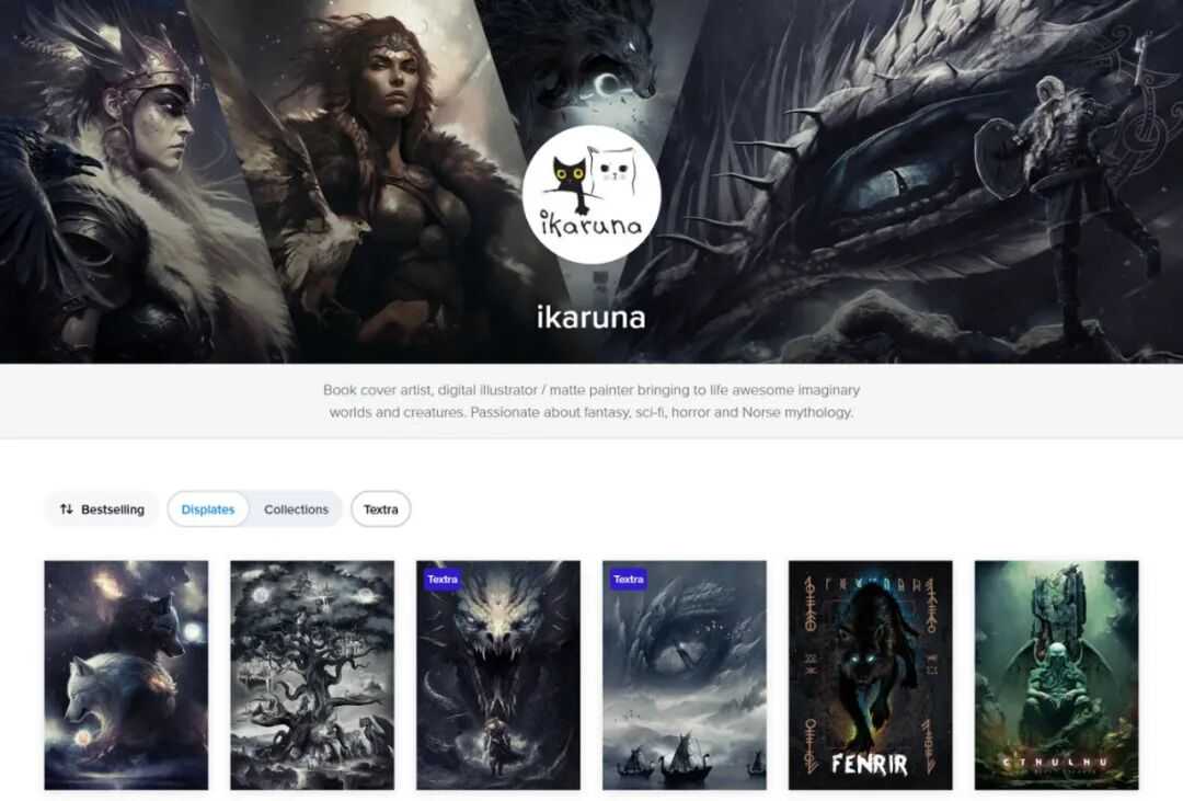 原告Theodora Ioana Magerand是罗马尼亚籍书籍封面插画师与概念艺术家,网名 “ikaruna”。她拥有地质学与古生物学背景,擅长将科学写实与奇幻想象结合,创作出兼具解剖学准确性与神秘氛围的北欧神话、科幻、恐怖题材数字插画。作品常见于 Displate、Etsy、Amazon 等平台的海报、墙旗、服饰、手机壳、拼图等衍生品,并长期为桌游、小说封面提供授权图稿。