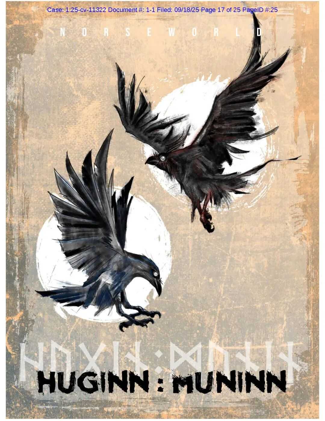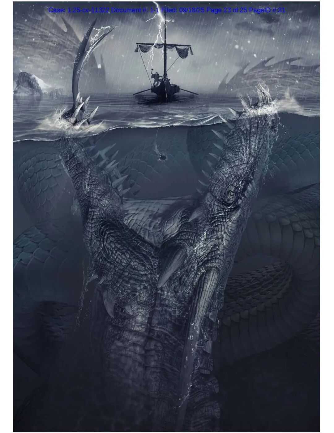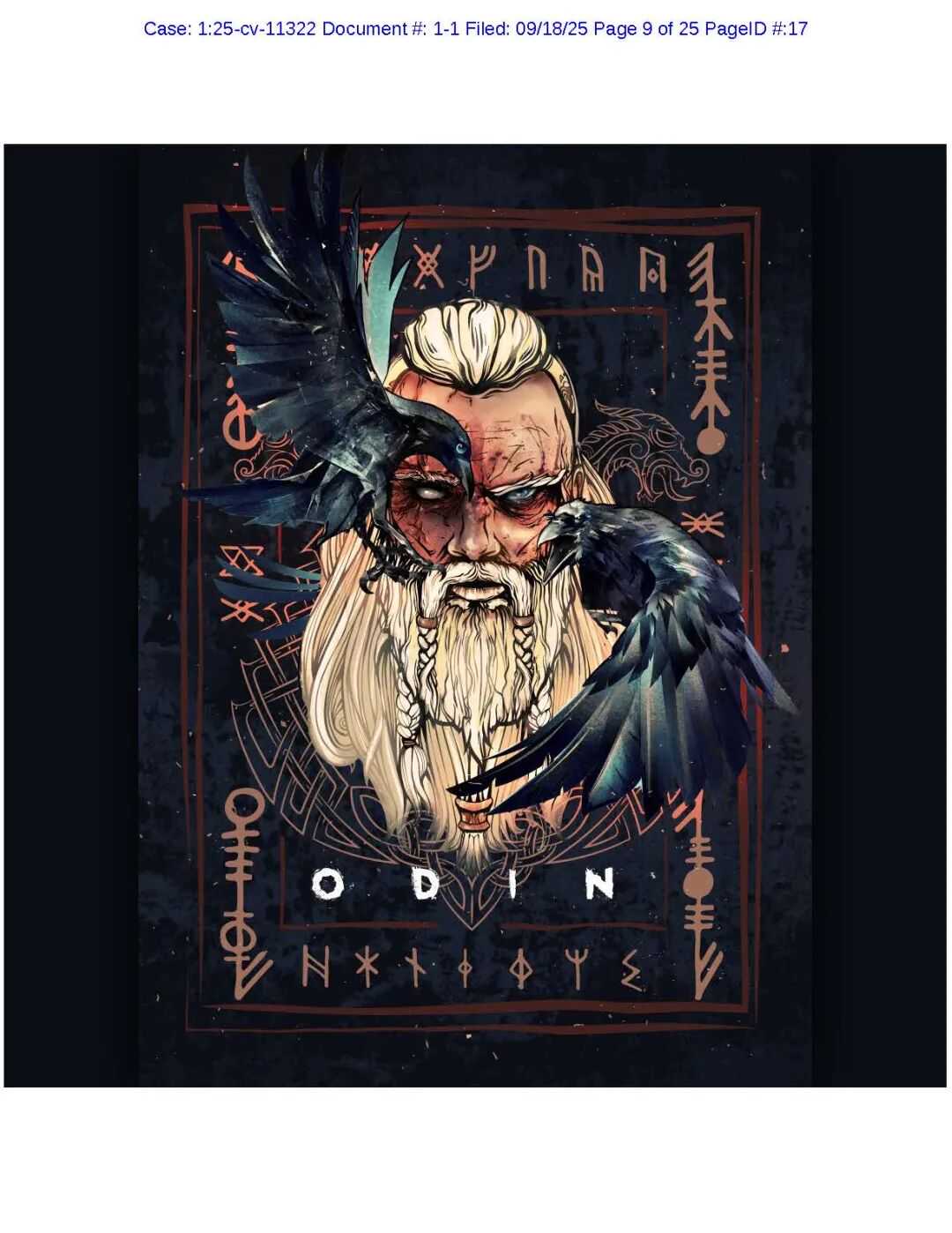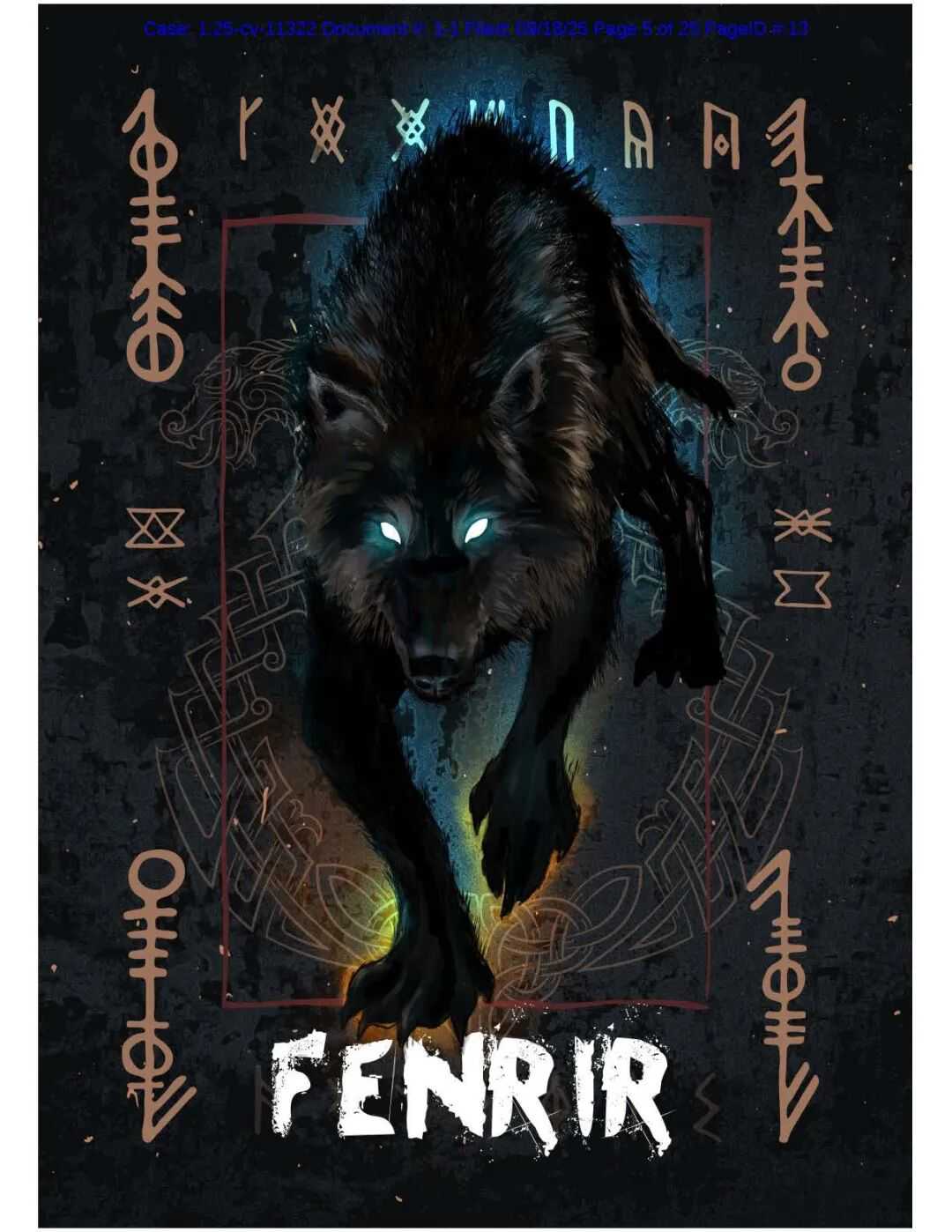 原告Theodora Ioana Magerand是罗马尼亚籍书籍封面插画师与概念艺术家,网名 “ikaruna”。她拥有地质学与古生物学背景,擅长将科学写实与奇幻想象结合,创作出兼具解剖学准确性与神秘氛围的北欧神话、科幻、恐怖题材数字插画。作品常见于 Displate、Etsy、Amazon 等平台的海报、墙旗、服饰、手机壳、拼图等衍生品,并长期为桌游、小说封面提供授权图稿。