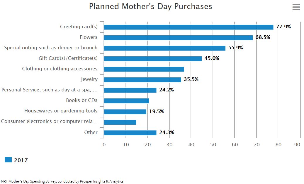 36%的消费者将购买珠宝配饰,此项消费将达到50亿美元; 56%的消费者将携母亲外出就餐,此项花费将达到42亿美元; 69%的消费者将花费26亿美元用来赠送鲜花; 45%的消费者会在节日卡片上花费25亿美元; 37%的消费者将会购买服装,此项消费将达到21亿美元; 15%的消费者会购买电子产品,并为此花费19亿美元。