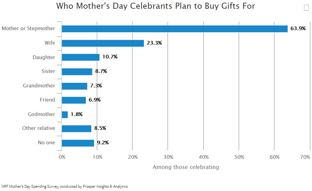 母亲节的主角不一定全是母亲哦,虽然超过60%的礼物赠送对象是母亲(或祖母),但是妻子、女儿、姐妹、朋友、教母等女性都是礼物的赠送对象。