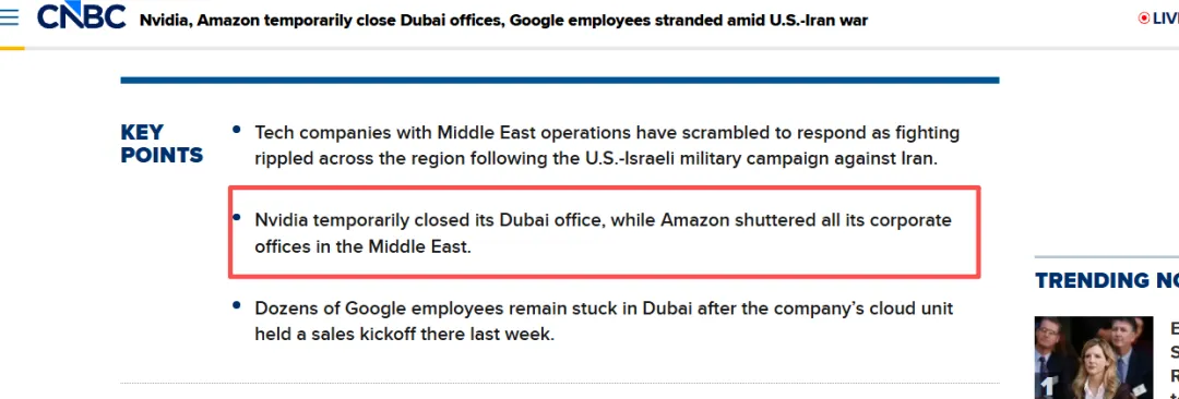 相较之下,亚马逊在中东的配送延误更为严峻。据法新社报道,亚马逊将当地配送时效至少延长 10 天,部分商品预计送达时间甚至拉长至 35–45 天。而据 CNBC 最新消息,亚马逊已临时关闭中东地区所有实体办公点,要求区域内员工全部转为远程办公,并严格遵循当地政府指引。