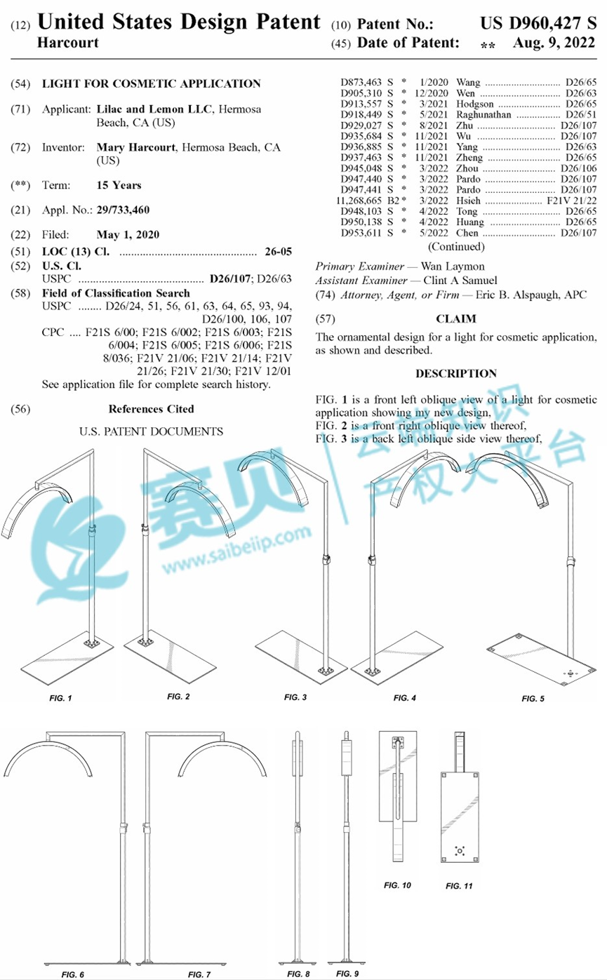 Cosmoglo, LLC由Mary Harcourt创立,专注于制造和销售现代化LED环形灯。该灯设计用于提供完美工作照明,特点包括亮度可调、360度旋转光环、手机夹及高度可调至5英尺。它适用于睫毛艺术家、美甲师及护肤专家,实现无阴影照明,便于拍摄。请注意,该设计受美国外观设计专利USD960427S保护(申请于2020年5月1日,授权于2022年8月9日),此后上架的相似外观产品可能存在侵权风险。