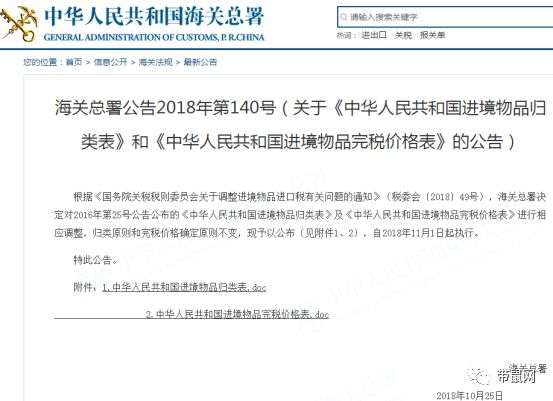 海关总署近日发布关于《中华人民共和国进境物品归类表》和《中华人民共和国进境物品完税价格表》的公告,内容指出,根据《国务院关税税则委员会关于调整进境物品进口税有关问题的通知》(税委会〔2018〕49号),海关总署决定对2016年第25号公告公布的《中华人民共和国进境物品归类表》及《中华人民共和国进境物品完税价格表》进行相应调整,归类原则和完税价格确定原则不变,时间自2018年11月1日起生效。