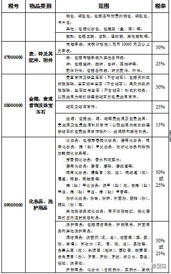 根据公告,新归类表包含27个物品类别,依次列明税号、范围和税率。以“食品、饮料、药品”为例,其税号为01000000,范围是“食品:包括包括乳制品、糖制品、调味品,人参、高丽参、红参、奶粉及其他保健品、补品等;饮料:包括矿泉水、汽水,咖啡、茶,其他无酒精饮料;药品:包括中药酒等。”其税率为15%,针对纺织品及其制成品25%、箱包鞋靴25%、化妆品及洗护用品50%或25%、厨卫用具及小家电25%、运动用品及钓鱼用品25%等。值得一提的是,在今年,国家还规定减按3%征收进口环节增值税的抗癌药品。