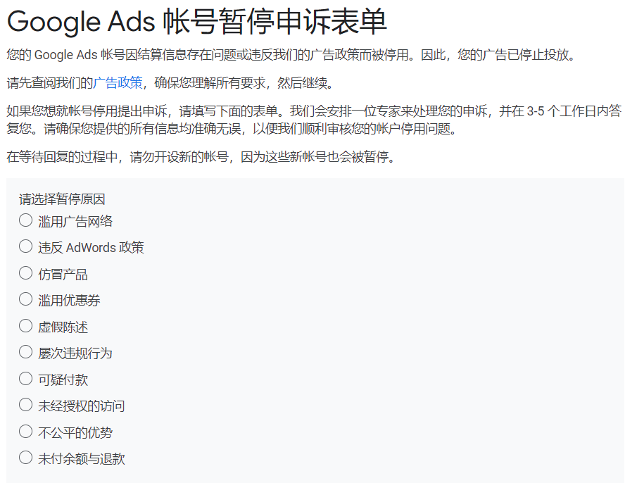 Google 一般会在 5 个工作日内作出答复,但有时可能需要更长时间; 在等待回复过程中,切勿开设新的账户。