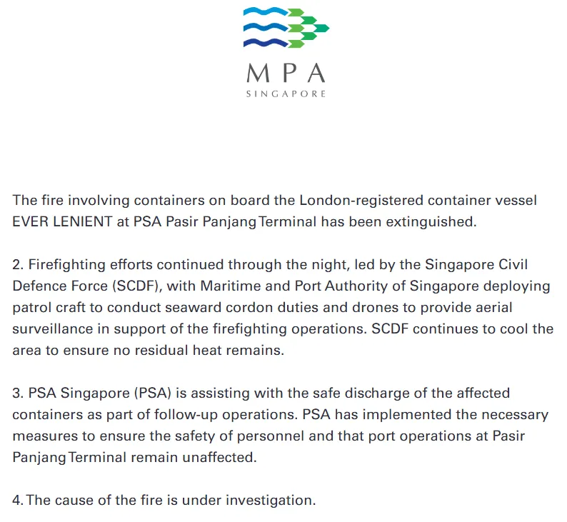 新加坡海事及港务管理局(MPA)在4月11日发布的最新消息中表示,停泊在巴西班让港的伦敦注册集装箱船“EVER LENIENT”号上的集装箱火灾已被扑灭。