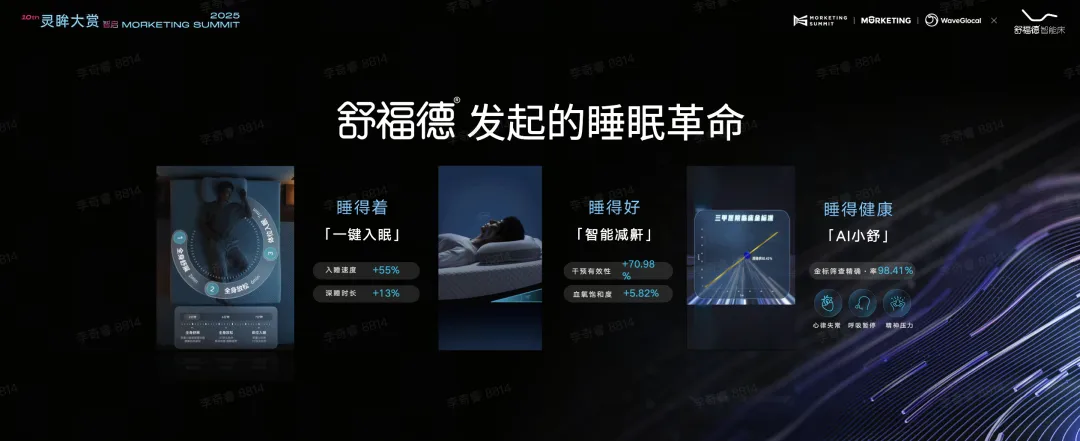 很多人,尤其是年轻人,都面临入睡困难的问题。过去,解决方式要么依赖药物,要么数羊,要么刷手机,但手机恰恰是影响睡眠的重要因素。通过软硬件结合和大数据分析,我们可以明确地看到,入睡速度平均提升了 55%,深睡时长提升了 13%。