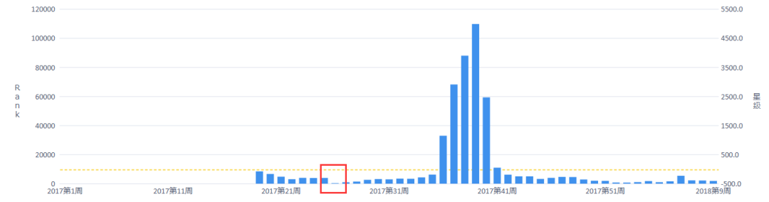 通过数据分析可以看到,该产品在Prime Day前几周上线,目的就是为了备战Prime Day,同时rank值在2017年第27周达到最高值(图中红框处)因此在Prime Day当周取得了比较不错的成绩。