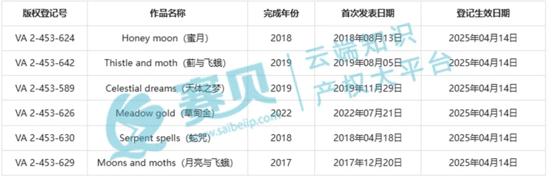 从赛贝TRO案件查询系统获悉,该案由立陶宛籍2-D插画艺术家Laura Ingeleviciene发起,Keith律所代理,涉案版权作品均为Laura Ingeleviciene原创,风格以细腻灵动、笔触柔和为主,兼具复古治愈感,擅长通过简洁构图搭配柔和色彩,展现自然、梦幻的画面意境(如《蓟与飞蛾》《天体之梦》等作品。
