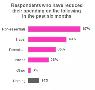 67%的人表示他们在过去六个月中减少了在非必需品上的开支。其次是减少旅行(49%)、必需品(35%)和公用事业(26%)的支出。