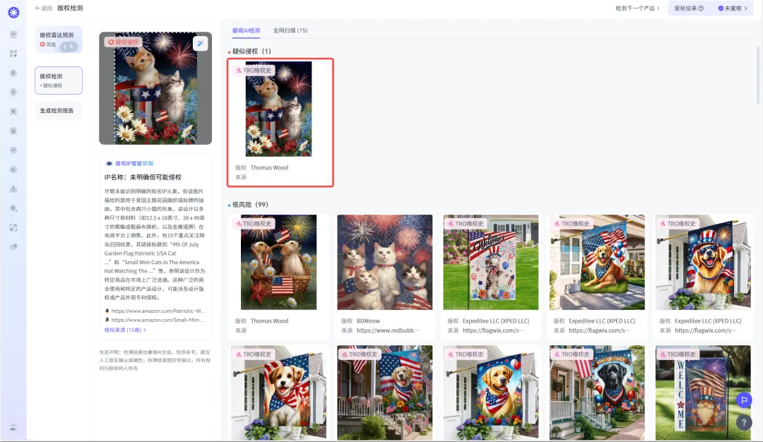 将此次发起维权的图片上传至睿观独家自研的版权检测功能后发现,Thomas宠物肖像系列插画已有TRO维权史。检测结果见下列图片: