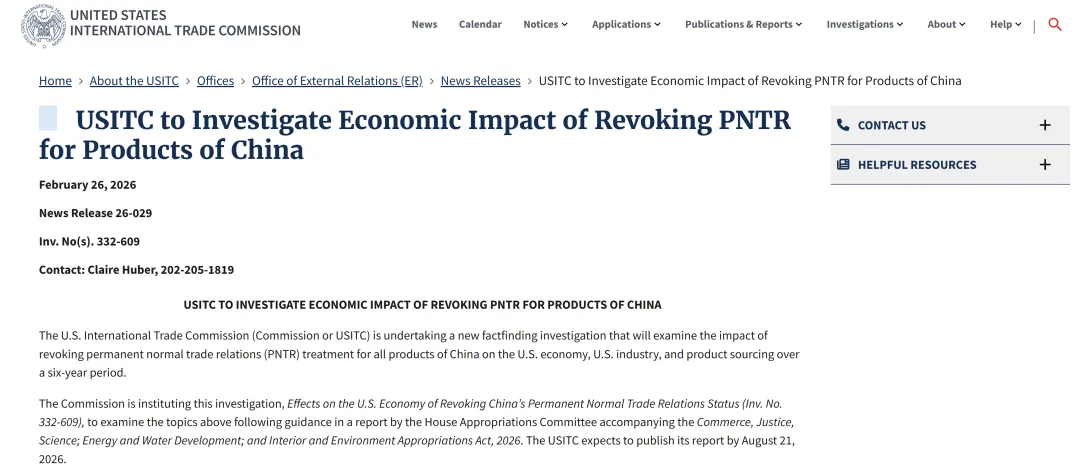 当地时间2月26日,美国国际贸易委员会(简称“USITC”)发布官方公告,宣布其正在进行一项新的事实调查,该调查将审查取消对所有中国产品的永久正常贸易关系(简称PNTR)待遇对美国经济、美国工业和产品采购在六年期间的影响。