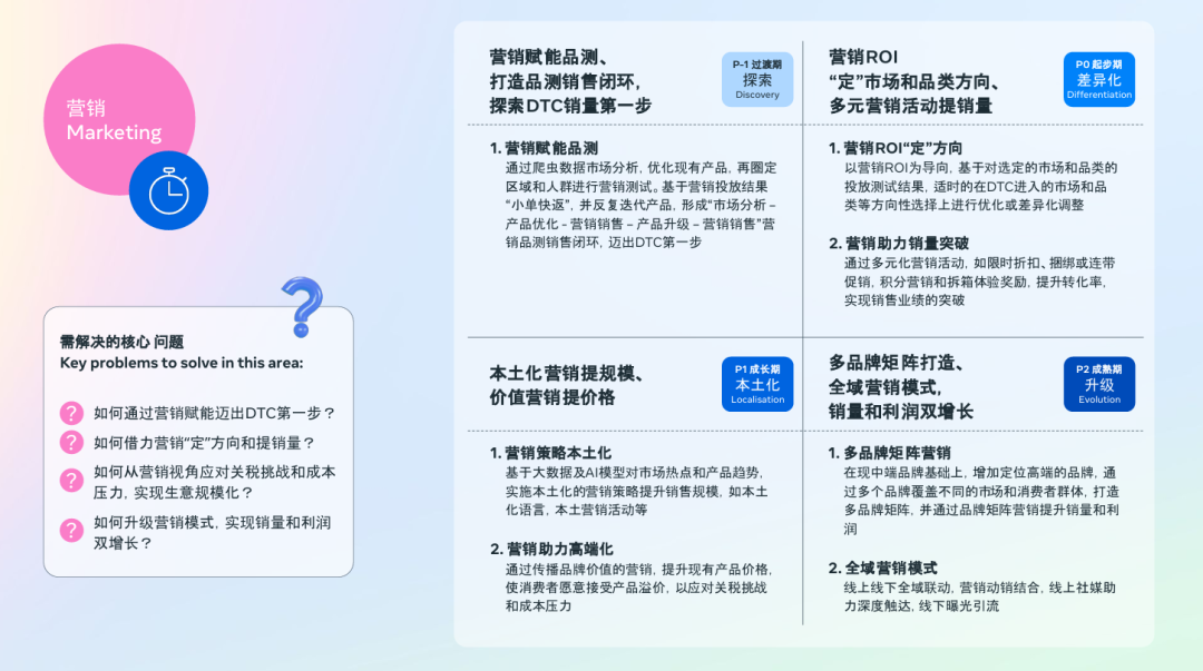 猎豹移动总结出一套完整的DTC品牌增长闭环图谱,从P-1阶段的探索,到P2阶段的升级,每个环节都有核心策略。