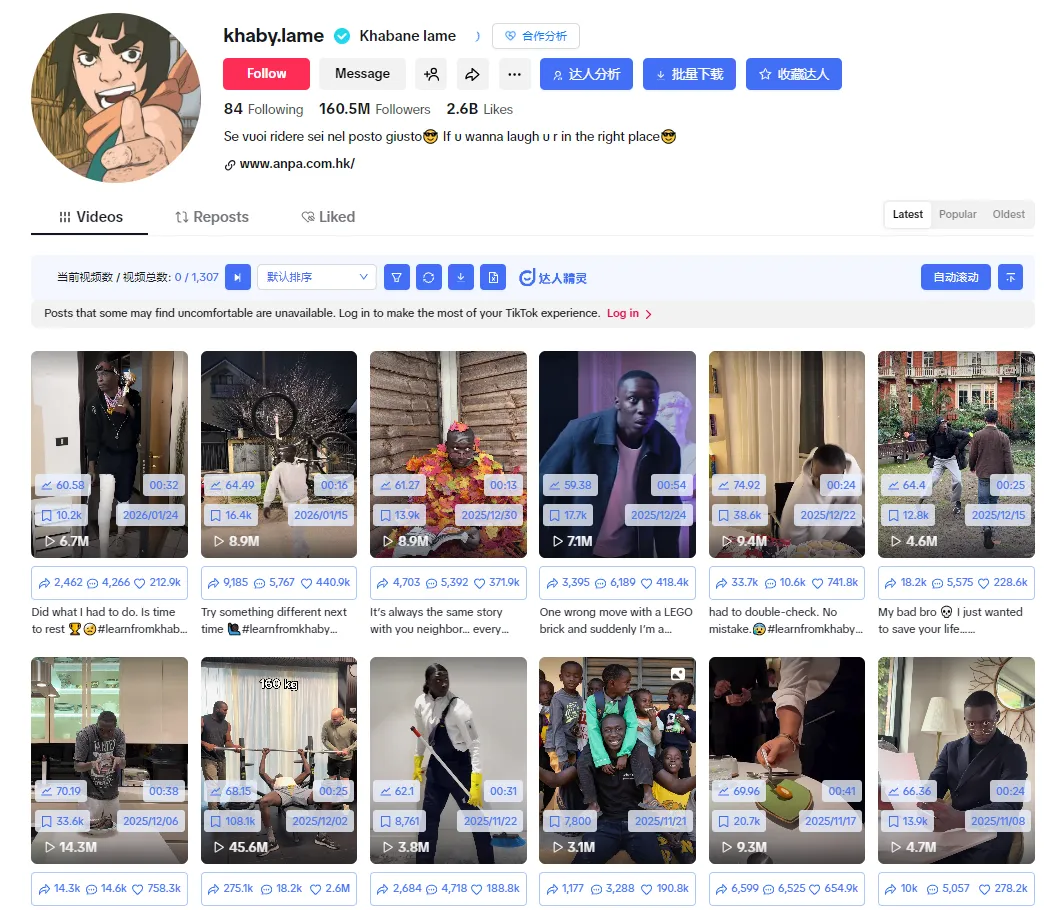 作为全球顶级网红,无语哥的流量实力不容小觑。据福布斯2025年全球创作者排行榜显示,其全平台粉丝数达2.59亿,位列全球第二,同时也是TikTok平台粉丝体量最大的网红。