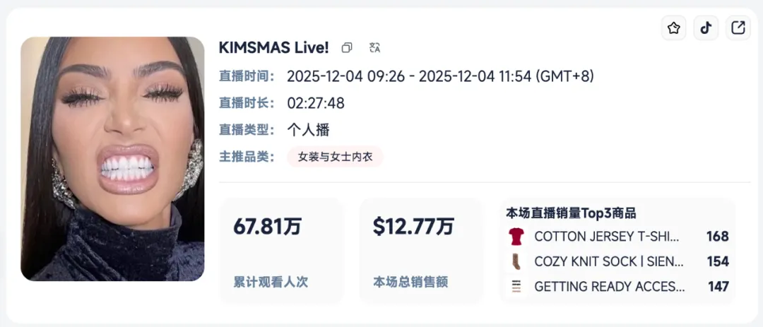 除了甲亢哥的趣味互动式直播,金·卡戴珊为个人品牌SKIMS打造的 “精品秀场式” 直播也成为典型案例,其直播间布置精致、氛围有序,通过模特优雅的产品展示,传递出舒适与奢华的生活理念,一小时吸引超67万观众,创造近13万美元销售额,不仅实现70美元的高平均客单价,自有品牌销量更是占比近八成。