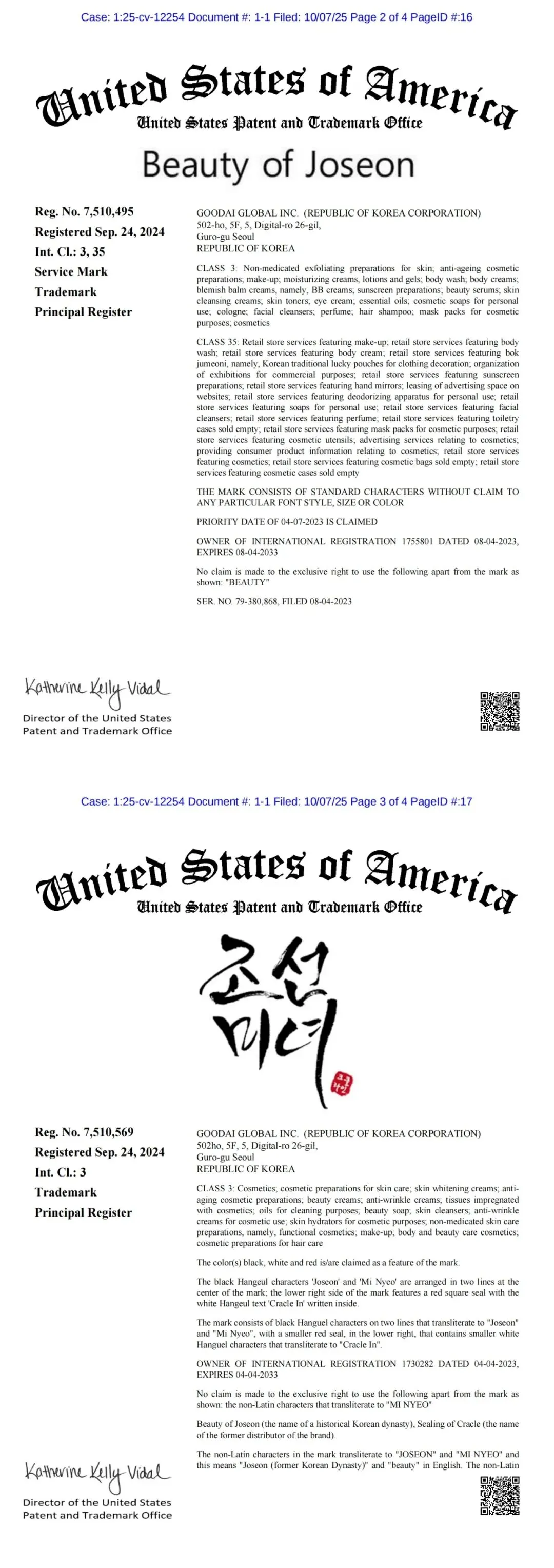 原告 Goodai Global Inc. 是一家基于韩国传统配方和技术的美容产品的发明者、制造商和经销商。本案为商标+版权双重维权,以下商标和产品图未经允许不得使用!