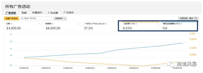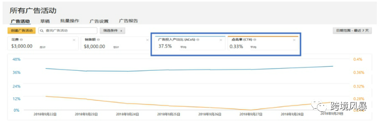 最后,ACOS和CTR。ACOS和CTR的趋势反映账户健康度,ACOS比较平稳,CTR小幅下降,同时下载广告报告,找出具体问题,从关键词层面进行优化,更需进行长期关注。