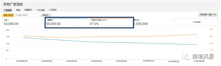 然后,销售额和ACOS。对比销售额和ACOS的趋势是否符合短期及长期目标,一方面是销售额略有下降,可通过下载广告报告具体分析;另一方面,ACOS比较平稳。