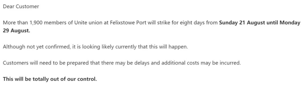 英国最大的集装箱港口费利克斯托港,1900多名工人计划在本月晚些时候举行为期8天的罢工。 划于8月21日开始的罢工除了对该地区的物流和运输部门造成影响外,还将对该地区的国际海运贸易产生影响。工会表示,罢工将造成巨大的破坏,因为许多罢工工人都是起重机司机、机器操作员和装卸工。预计港口运营将接近停止。 英国最大的集装箱港口费利克斯托港的工人在拒绝7%的加薪后将举行为期八天的大罢工。位于英格兰东部的费利克斯托港每年处理大约400万个集装箱,几乎占英国集装箱贸易量的一半,主要得益于邻近法国勒阿弗尔和荷兰鹿特丹等欧洲港口。此次罢工预计将影响英国40%的集装箱进口。 运输部发言人表示:“工会的这一罢工行动将会扰乱重要物资和货物的运送,我们敦促工会和港口留在谈判桌旁并达成和解。”联合工会干事Bobby Morton说:“罢工行动将造成巨大的中断,并将对整个英国的供应链产生巨大的冲击,但这场纠纷完全是该公司自己造成的。” 菲利克斯托港在一份声明中说,公司继续积极寻求对各方都有效、避免劳工罢工的解决方案。 虽然还没发生但是大家要做好准备,发往英国的货物可能会出现到港提柜受到一定程度的影响