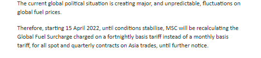 从4月1日起,托运人也将面临北欧的大多数海运承运商将在其航线运输成本中增加25%的燃油附加费。 日前,MSC表示,当前的全球政治局势正在对全球燃料价格造成重大且不可预测的波动。因此,从2022年4月15日起,在情况稳定之前,MSC将对所有亚洲交易的现货和季度合约,按两周而不是每月的费率重新计算全球燃油附加费,直至另行通知。 高丽海运已发布通知,4月1日开始实施调整后新的LSS(第二季度),相比第一季度已有调升。 ↓↓↓ 提高燃油附加费以及飞涨的运输成本。那么势必物流价格也会上涨!有发货计划一定要提前,并且做好提前备货规划。