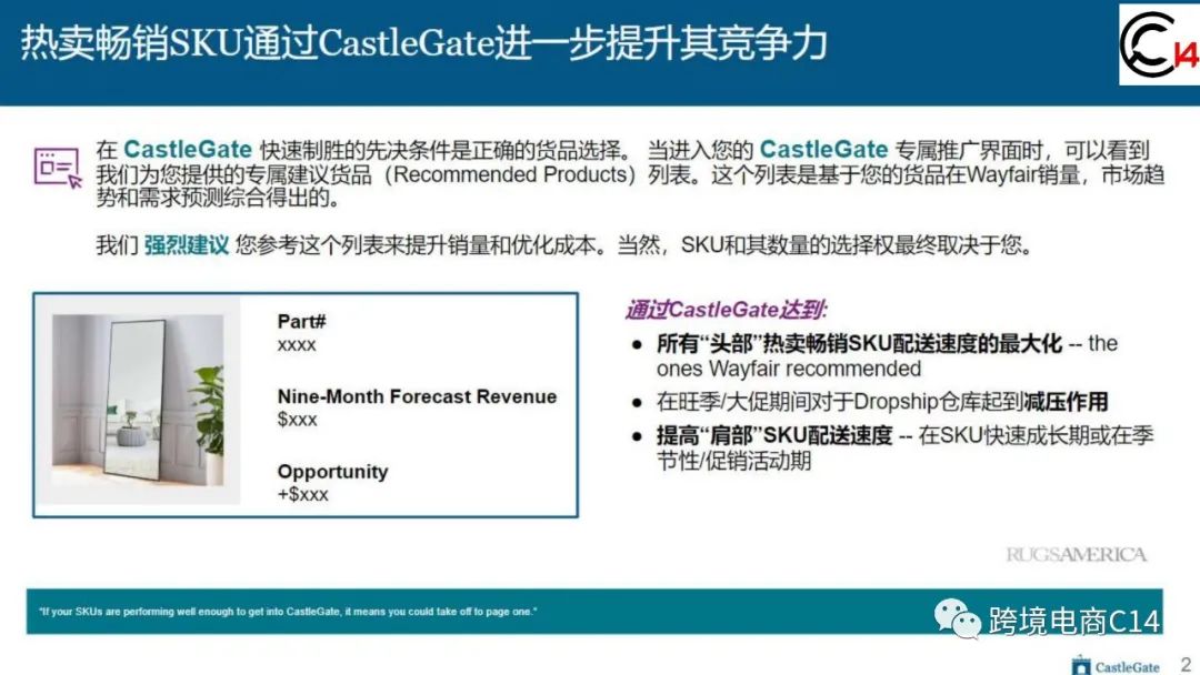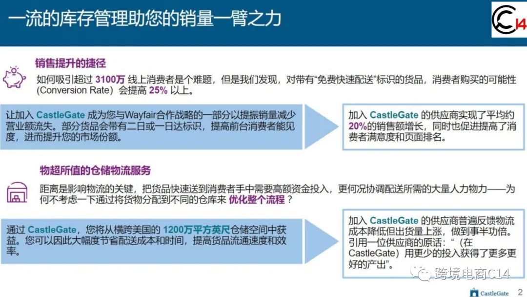 目前CastleGate是越来越容易申请了。CastleGate就类似亚马逊的FBA,加入后不仅仅不需要再操心海外仓发货时效的问题(这个有时候很让人抓狂,有订单,海外仓就是拖着没发);也会增加不少转化率,毕竟买家收到货的时效更快了。而且流量上也有扶持,总之一句话,尽快申请加入;卖的比较好的产品可以尽快入仓。CastleGate是wayfair大卖必备良药。