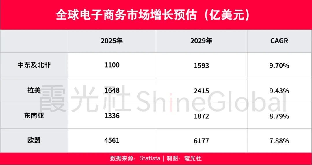 更重要的是,这股增长势头还在继续。Statista的预测显示,拉美电商2025-2029年年均复合增长率将达9.43%,是全球第二大高增长地区;而且其电商规模也是新兴市场中最大的。