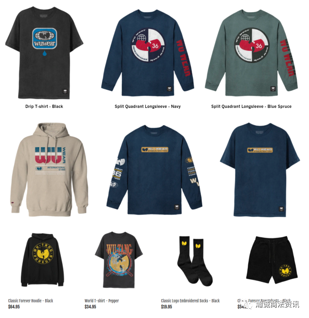 原告Robert Diggs是一名美国说唱歌手、演员、电影制作人、唱片制作人,以及嘻哈组合武当派Wu-Tang Clan的领袖。Wu-Tang Clan 乐队于1992年在纽约市史泰登岛成立,并于次年发行了首张专辑《Enter theWu-Tang》。除此之外,Wu-Tang Clan还推出了自己的服装系列,名为 Wu Wear,主要销售服装、鞋类和配饰等产品。其官方线上商店主要有:https://wutangclan.com/和https://wuwear.com/。下图是在其官网上部分产品截图: